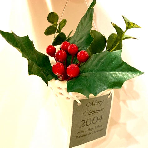 2004 – Cornucopia with Holly – A few minutes in a craft store was all it took to find this year’s ornament. We assembled this with an off-the-shelf ceramic container, some artificial foliage, and a custom tag.