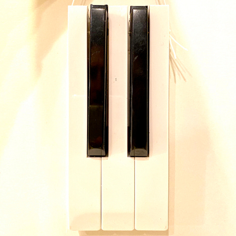 2019 – Piano Keys – When Scott’s Korg 01/WproX piano started to bite the dust, he tore it down to be recycled. It seemed appropriate to upcycle the keys into ornaments, given that 7 octaves contained the requisite C/D/E combination for this ornament. Also appropriate since Elizabeth began her college education this fall as a music education major with a concentration in Piano.