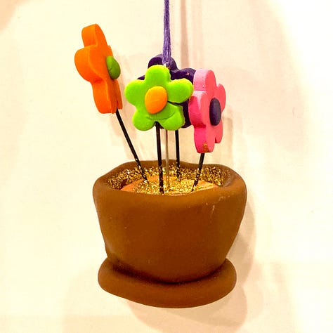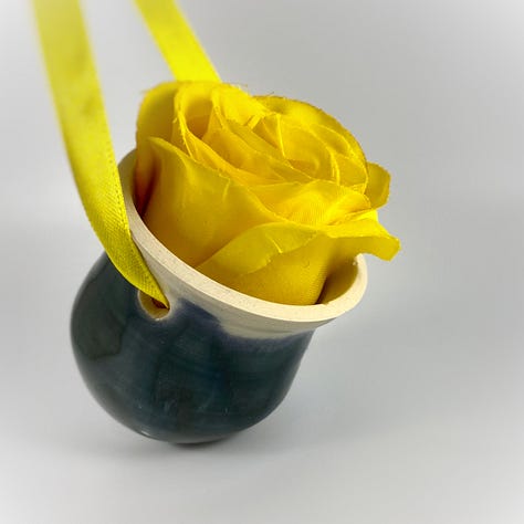 2020 – Pottery Vessel with a Yellow Rose – Elizabeth made this year’s ornament to remember her grandma, Diana Bradham. Elizabeth threw, glazed, and fired all of the pottery vessels (20 in all) and placed Diana’s favorite flower (a yellow rose) in each.