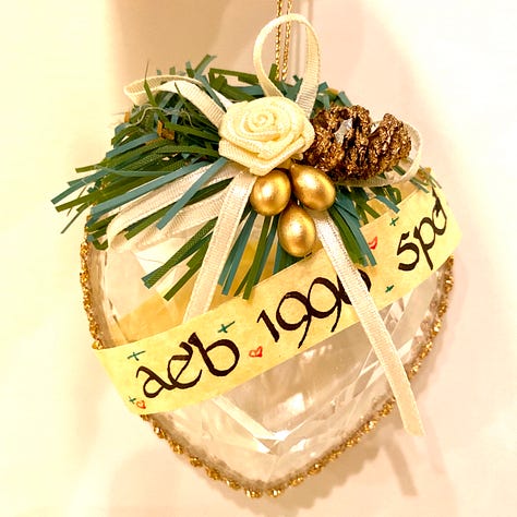 1996 – Calligraphy Heart – Amy and I started dating on Columbus Day Weekend in 1996. I found these hearts in a craft store. I took a calligraphy class in college, so felt comfortable scripting our initials and the year on some parchment.