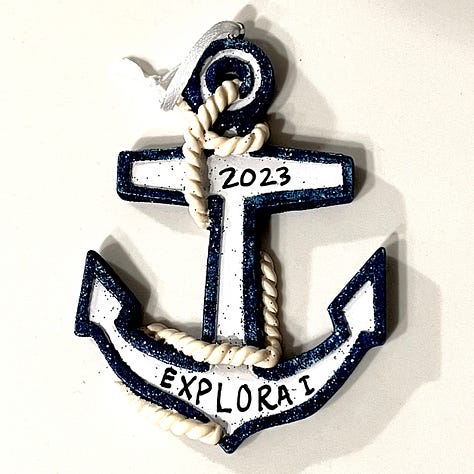 2023 – Explora I – Xander was a working musician on Explora Journeys’ Explora I for much of 2023, so we commemorated the occasion with a nautical ornament we purchased from a Christmas shop in New York City’s Little Italy.