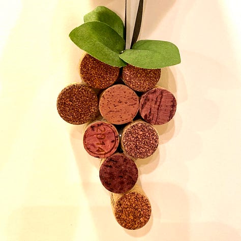 2016 – Cork Grapes – We drink wine and save the corks. These ornaments are a nod to our local wine region. We were inspired by a Pinterest idea for using corks for these bunches.