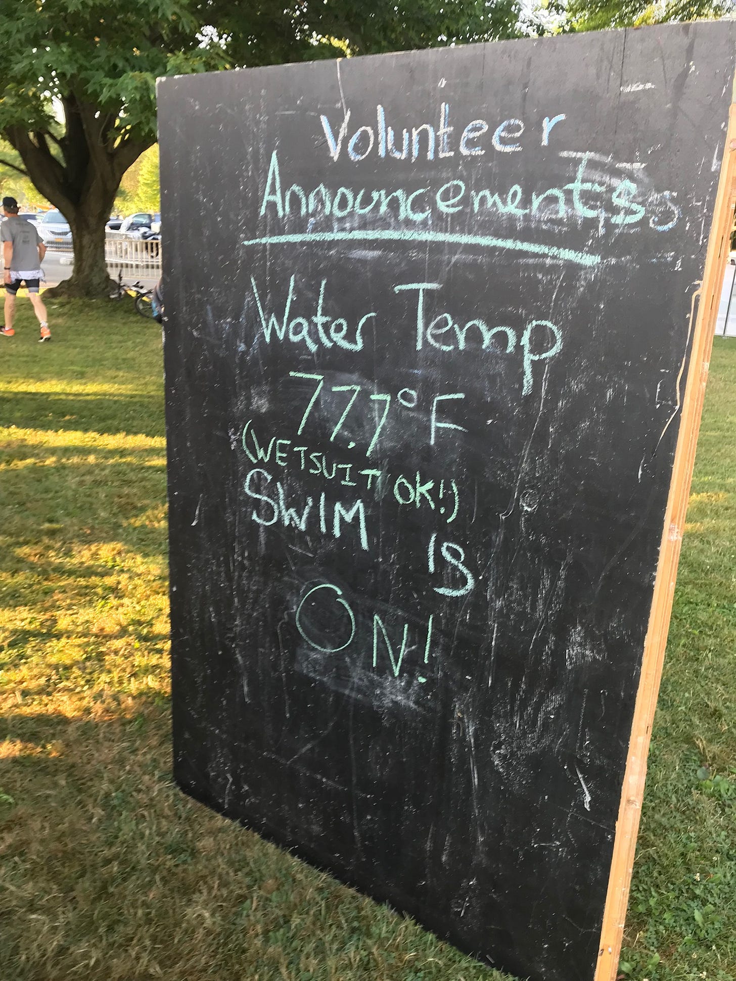I love my wetsuit. It provides just a touch of buoyancy and helps me feel a bit insulated from the things I cannot see in the water (fish, seaweed, and cold patches). When the water temperature was precipitously close to 78 degrees, the legal limit for wetsuits, I admit I was a little nervous. Whoever took that 77.7 degree temperature on race morning ... thank you!