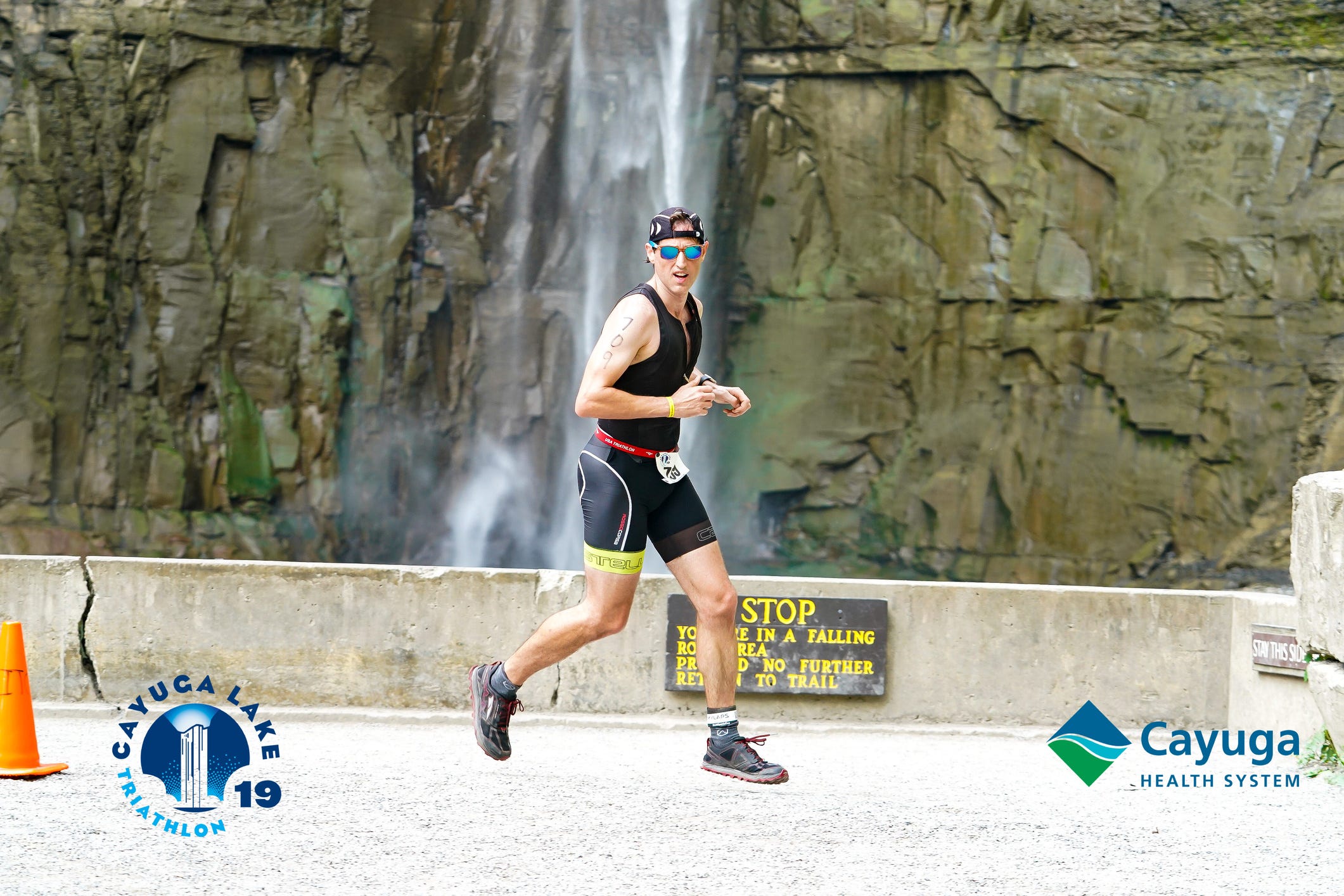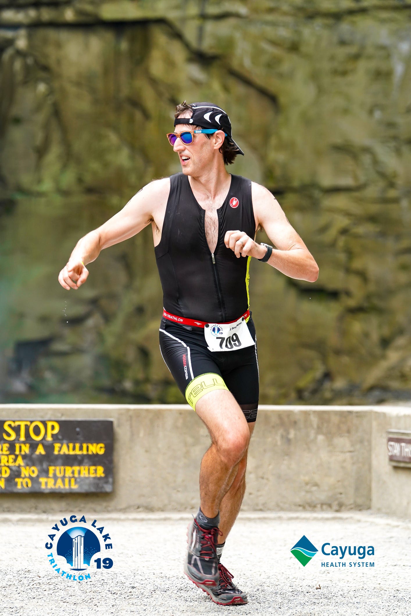 I passed the Knapp family cheering squad as I crested the last of the rises out of the park. They’re always energetic and fellow frequent hikers (and photographers) in the park. It was a beautiful morning for a ride and I found myself smiling a lot as I looked at views of the lake. I bombed down the hill into Sheldrake. Apparently it had recently rained there, but it hadn’t at the park. I thought that was interesting and watched my speed as I shallowed out on the curve into the “Sheldrake Sprint.” The neighborhood’s residents were out in force again, cheering with their cowbells. The sprint was over all too soon and I found myself climbing back up to 89 for the return trip. I always feel exhilaration when I pass the police marking the road closure for the descent back into the park. Despite hitting my max speed of 39.1 mph on the descent, I got passed (quickly) by a younger intermediate racer on a very nice tri bike. I remarked to myself just how much money you could invest in this sport if you were really serious about it. He was really hauling, and I have no doubt a lot of it was training. A lot of it is bike, though, isn’t it? I crossed the grassy strip that marks the entrance to the park and headed to transition for the final run segment.