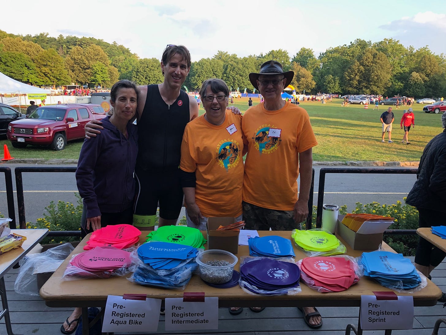 Packet pick-up was super efficient. We talked with Ian Golden and Alex Kleinerman (the race director) while we waited for the kids to pick up their relay packets. Just a week prior, the kids’ relay swimmer notified them that they couldn’t swim for them. That was cause to panic a bit: it’s hard to find another swimmer on short notice! However, Elizabeth quickly put an appeal out of Facebook and quickly found a new swimmer. She was participating in the national championship the following weekend, and really was happy to jump into the Cayuga Lake Triathlon as a training effort. This was pure serendipity: the kids would have a pro on their relay team! She met them at the store so they could pick up their packets together.