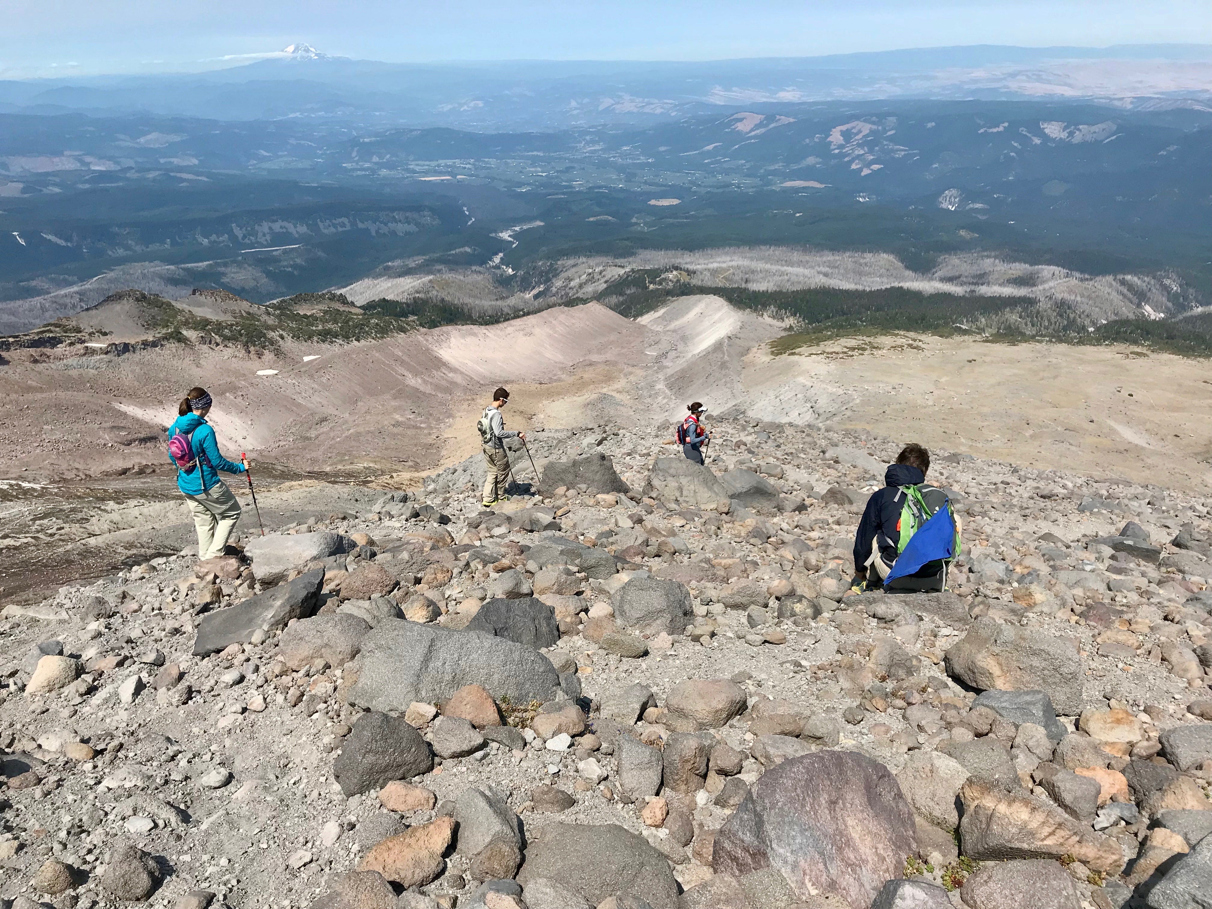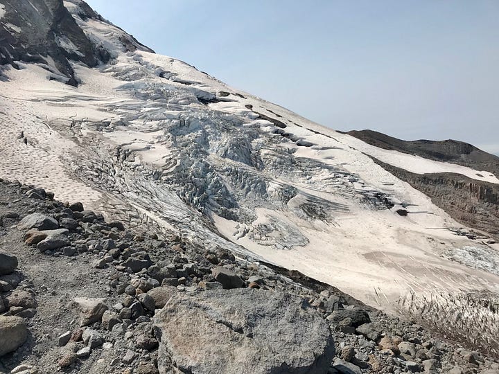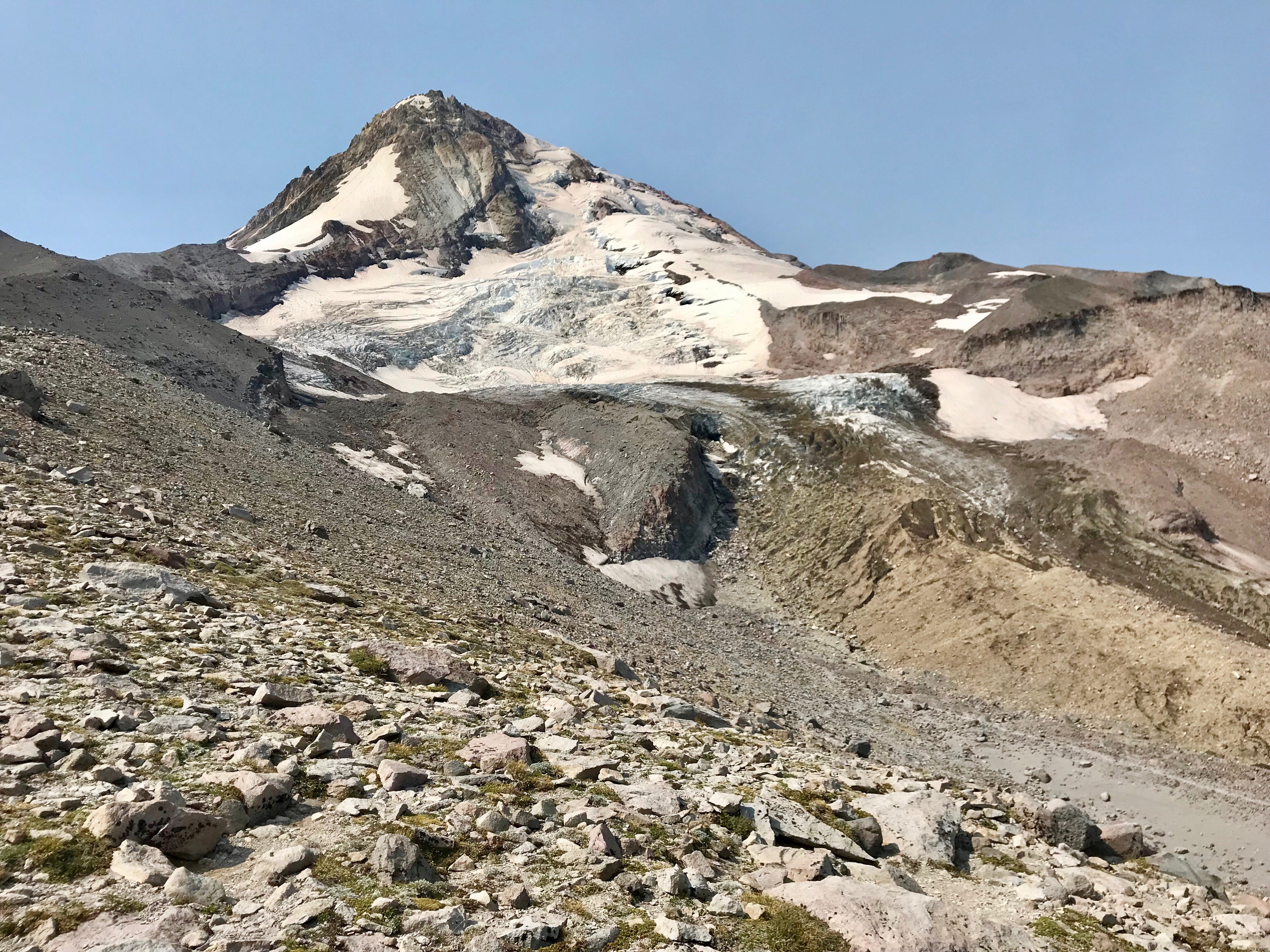 We took a brief detour on a spur trail to view Eliot glacier. Sarah and Adam were shocked at the lack of coverage of the lower glacier and took time to point out how low they’d encountered ice in prior hikes. We watched a few parties below who were practicing their skills on portions of the glacier.