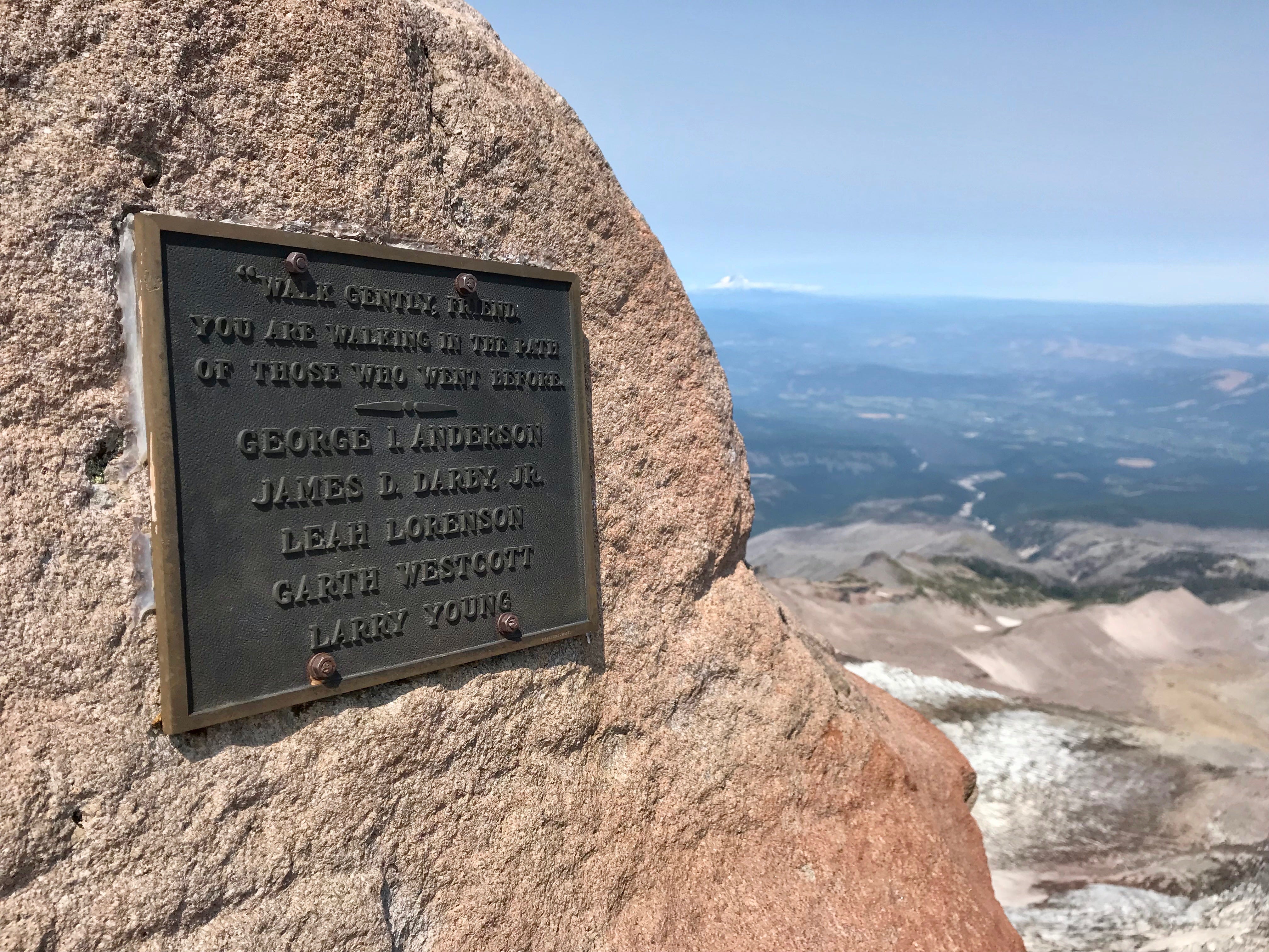 The plaque on tie-in rock commemorates five climbers who died on June 21, 1981. They fell from Cooper Spur while descending, and the plaque implores climbers to
