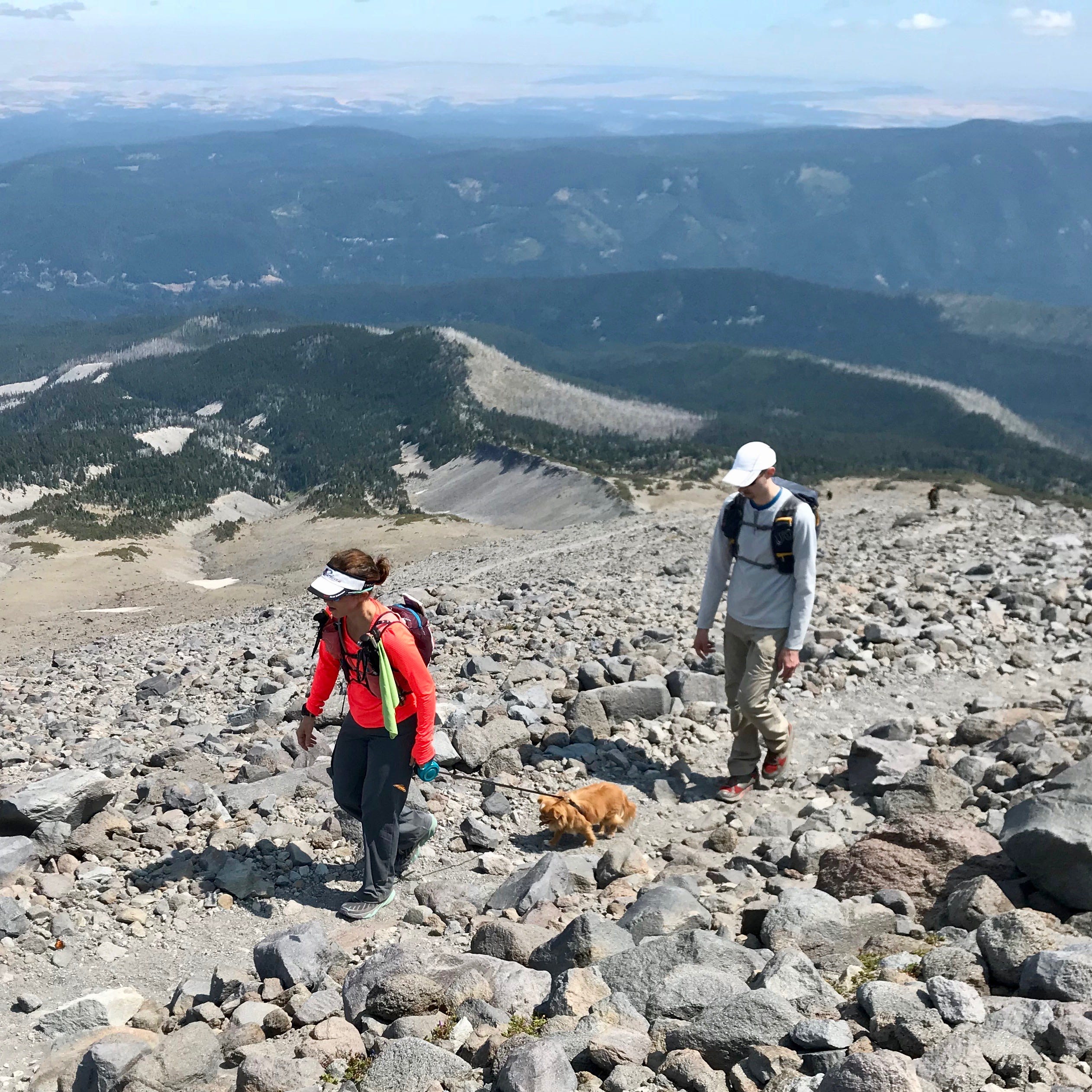 It’s a 12-mile drive up the access road to Cloud Cap on the eastern flanks of Mount Hood, but it takes a strong stomach and about a half hour of careful driving. We debated who among us should get the cherished front seat, the place least likely to induce carsickness (you can check out a back seat perspective of the drive in the video below). It was all for nothing, though, since we all gratefully stayed healthy during the ride to the top. Sarah, Adam and Quiggly joined us for this hike. We were a party of six, plus a small and determined dog!