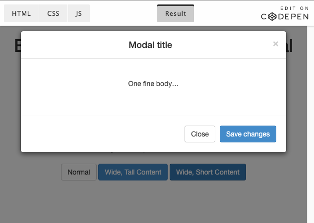 I created CSS classes to handle the width, and the optional introduction of a scrollbar for extra-tall content. Then, I just add “modal-wide” to the main modal div. In the example below, I’m using 90%.
