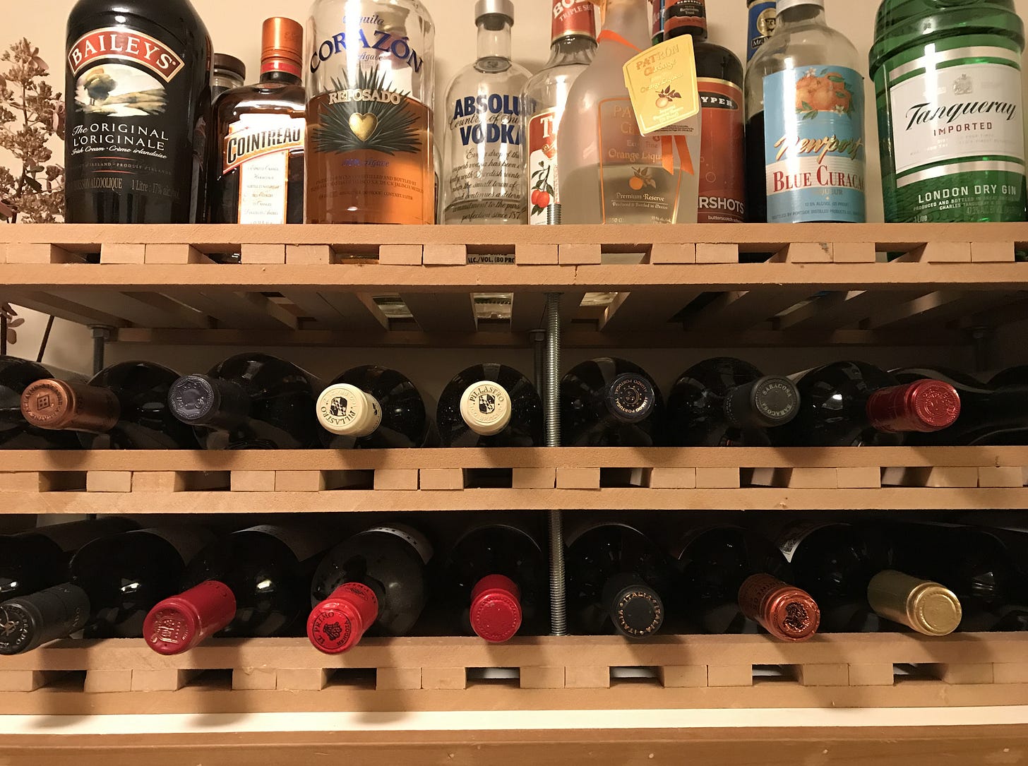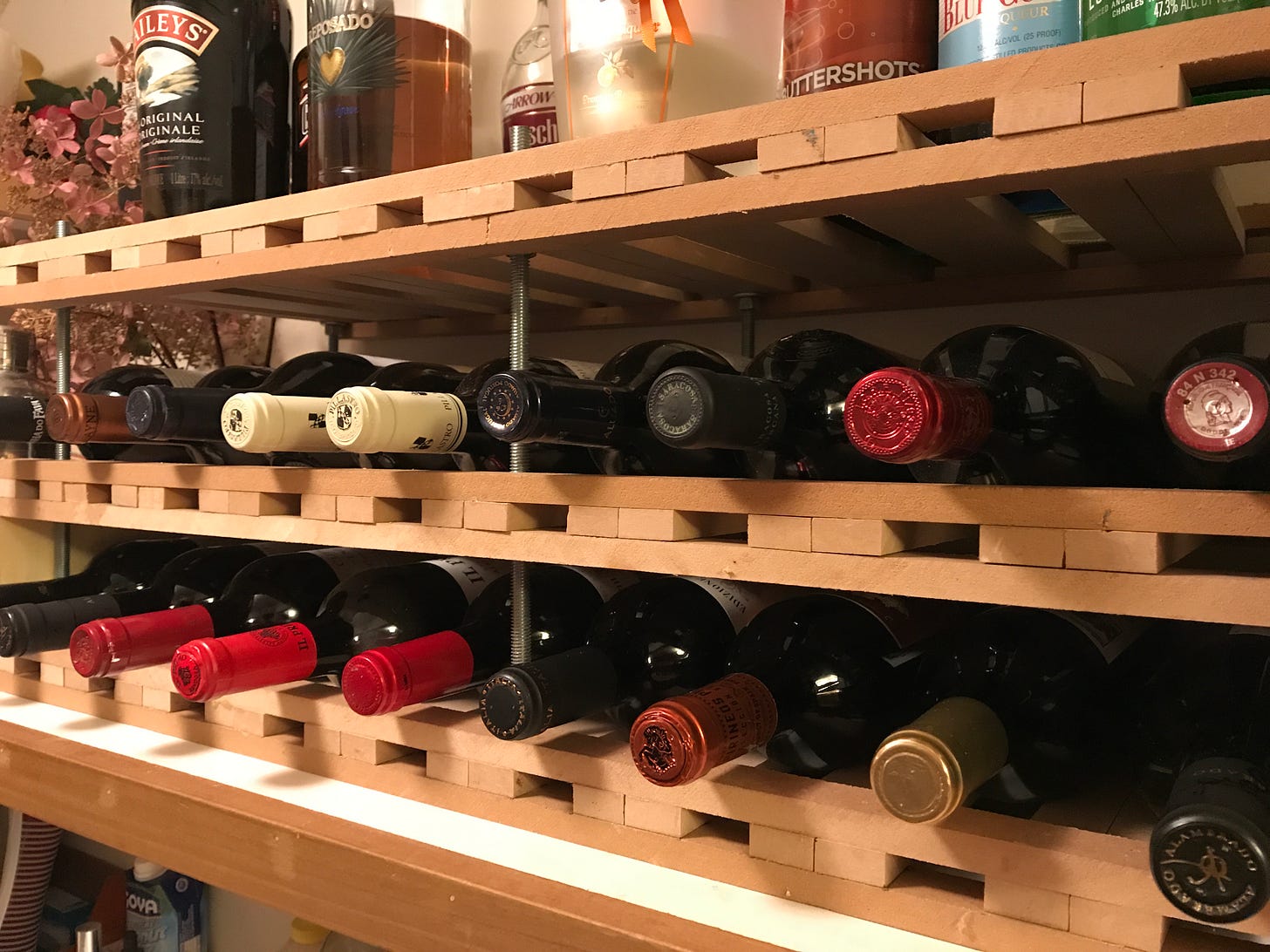My little 12-bottle rack hung high on the pantry wall was no longer going to cut it. It was time for a high-capacity DIY wine rack.