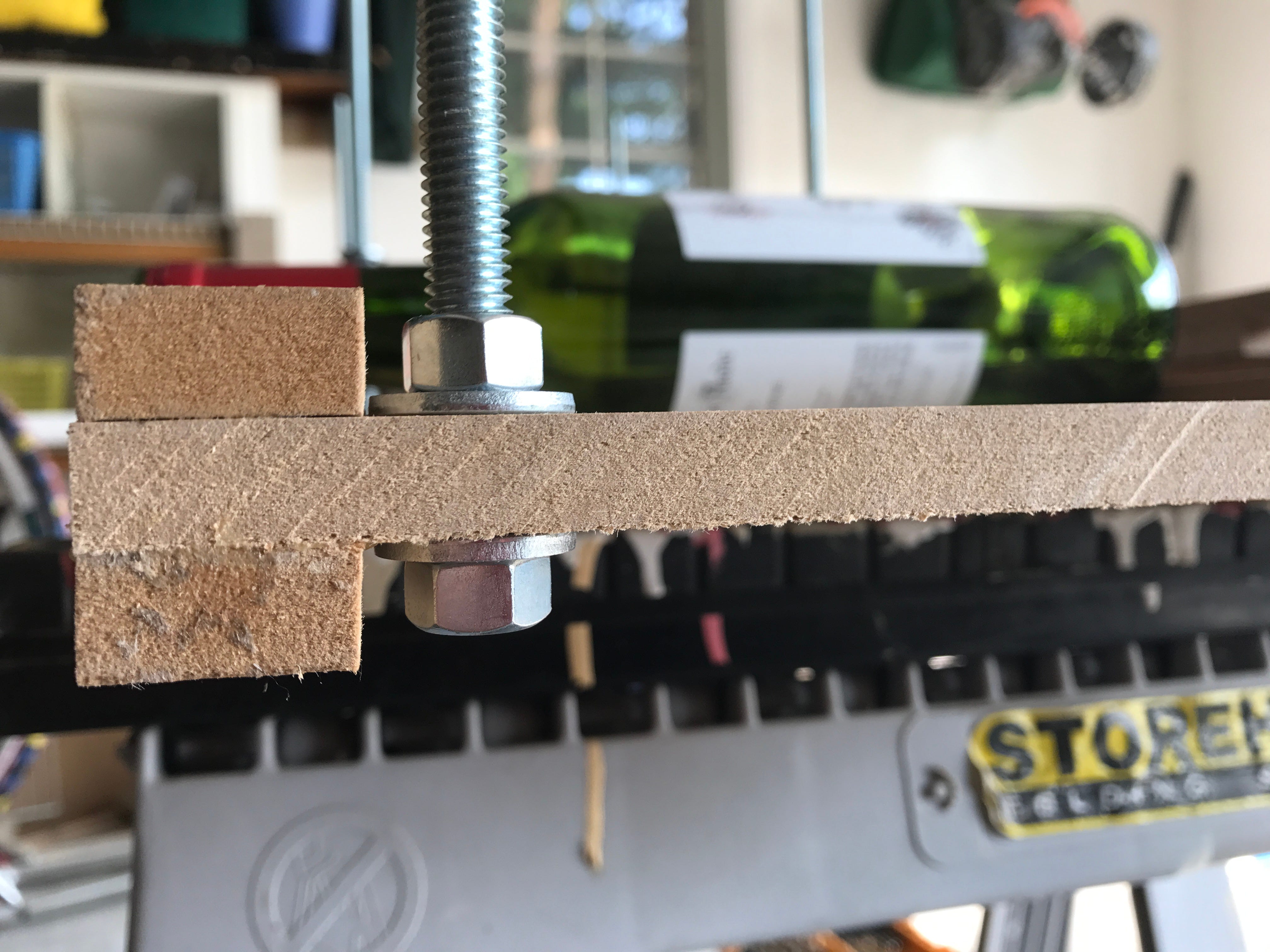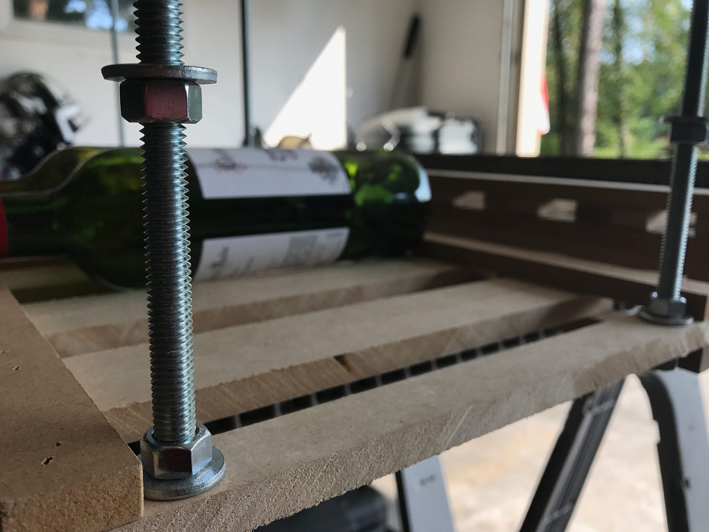 I headed to my local hardware store, Stover Lumber, and told them what I needed for my DIY wine rack. I thought I’d find bolts that were 12” long, and though they had them they were only threaded at the end. They suggested threaded rod. Perfect! I got some ⅜” threaded rod in 36” lengths. I’d need to cut them down to size, but they’d work really well. Back home, I used my hacksaw to cut the rods and then loaded my drill up with a ⅜” bit. I placed some sample bottles in the bottom tier to confirm my placement of the holes that would receive the rod. I’d chosen to place the rod at the four corners, and also directly in the middle. Since the holes are through the 12” piece and not the three pieces sandwiched in the corner (I’d have hit nails with the drill if I did that), the hardware under the threaded rod would be totally hidden under the 12” piece). I used a washer as a guide to start each hole to ensure sure they were all centered and approximately in the same spot.