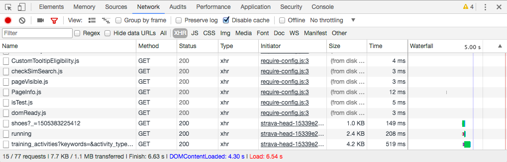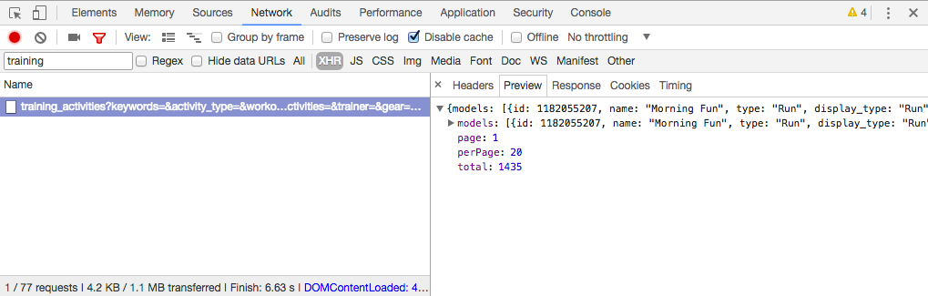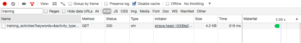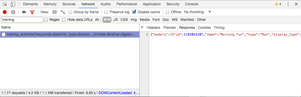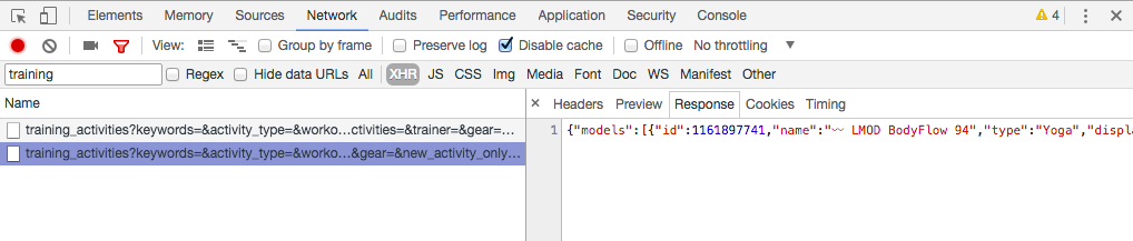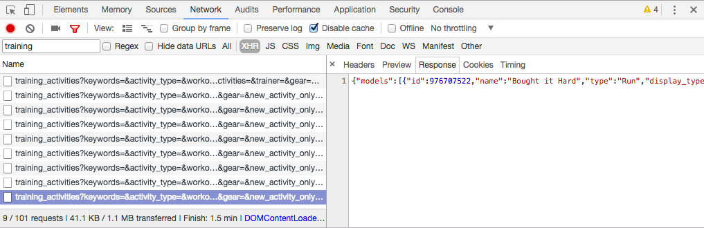 Web pages can make a lot of requests in the background for data. In this case, we’re looking for one called training_activities. In the upper left corner, under that red dot, you can search for “training” and see just those requests, which is what we’re looking for.