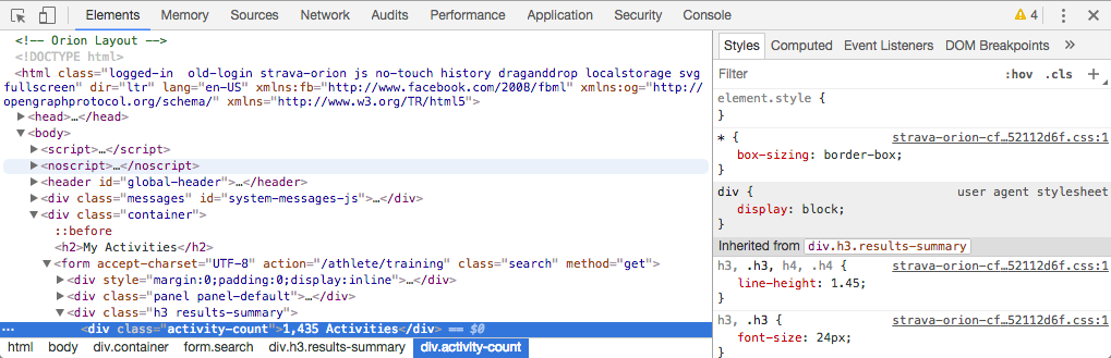 Going through workout-by-workout just wouldn’t cut it. I needed a spreadsheet I could sort, filter and enrich. The resulting poster was just as I’d hoped for! It turns out I’m also a technology geek, so I figured out how to export Strava data into a spreadsheet so I could get the numbers I needed for my poster. There are a few steps involved, but it’s not THAT hard. Grab a cold one and get your browser console ready, ‘cause we’re going to go on a Strava data expedition!