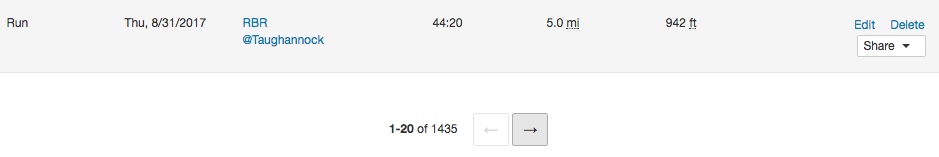 Now we can go back to our Strava tab, scroll to the bottom of the 20 workouts shown in the actual web page, and click the Next button to view the next set.