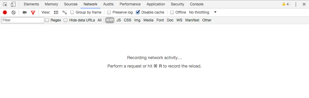 In the inspector, there are navigation options along the top. Click Network. Below that, you can filter network traffic by type. We’re looking for XHR, so click that. Now, any data request the browser makes back to the server will be summarized here. Who knew browsers could show you such cool stuff?