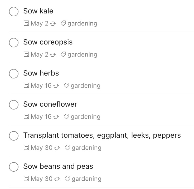 🍅 Gardening season is getting in full swing! I have some seeds starting inside now: tomatoes, eggplant, leeks, and peppers. As these weeks pass by, more delicious things will get sown and transplanted. The screenshot below is from my Todoist, by the way. I had a nice talk with a colleague this week who’d been using Apple Notes as a way to keep track of tasks. They were intrigued by what Todoist offers for free users.
