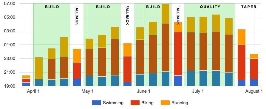 One of the things I really like about tracking my workouts in Strava is the ability to look back and see trends and totals of my training. Charting the amount of time spent each week working out for the 18-week period (plus the week prior), it’s clear what the plan accomplished: three building periods, punctuated by fallback weeks (for recovery), a final “quality phase” designed to build speed, and a final taper. In a typical week, there’d be three of each discipline, so yep: a few double workouts each week. Some creative scheduling got it all in, though!