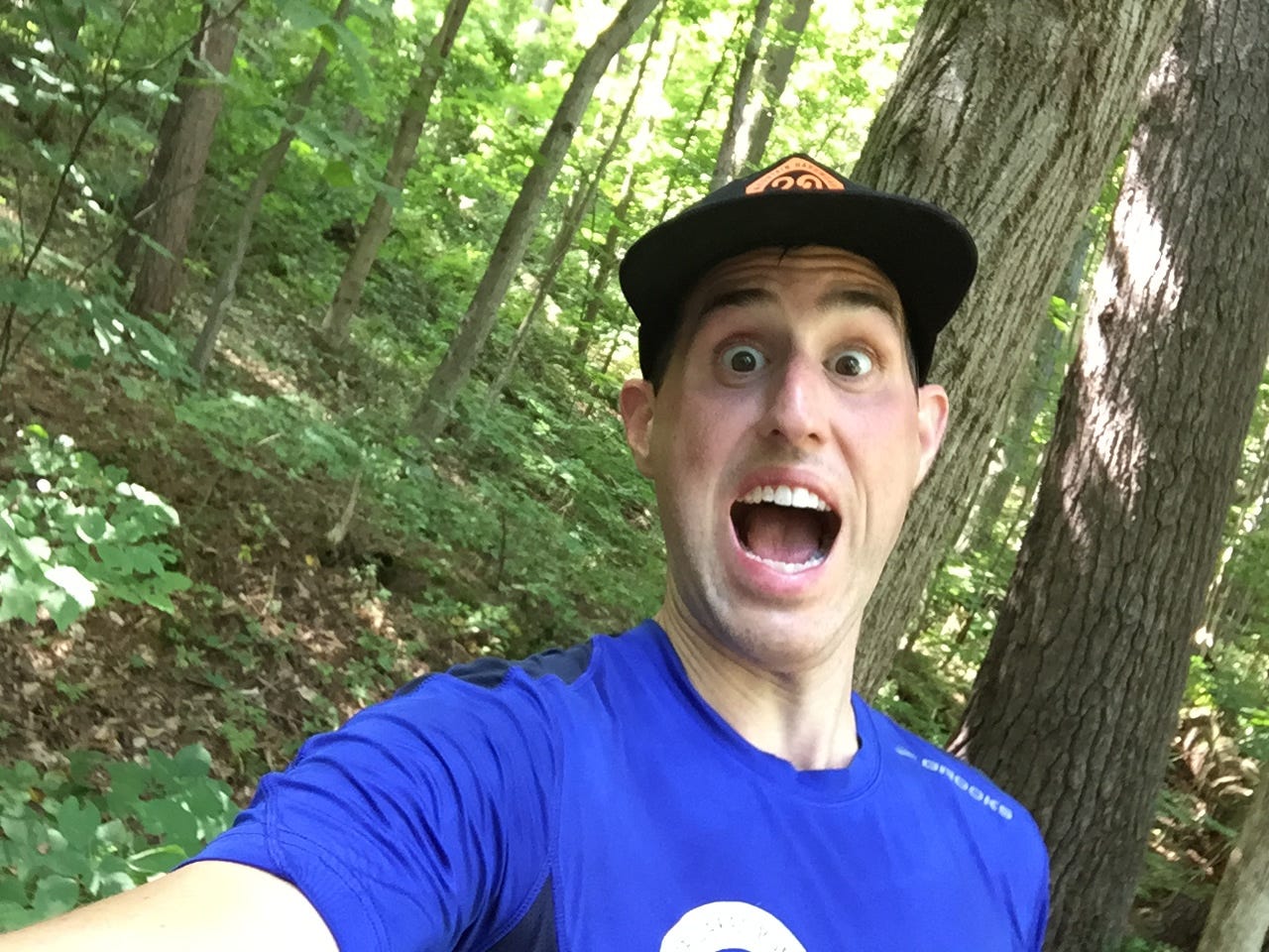 Last year’s start was further along the course than this year’s start, due to some pretty epic flooding. This meant that we got the pleasure of not one, but TWO water crossings this year. To be fair, the first crossing is across a roadway where, by design, a creek crosses with 3-6 inches of water. Shortly after Ian blew his traditional ram’s horn to start the race, we were splashing our way through this waterway and then began the ascent of the North side of the trail. I had lined up near the front, and found myself quickly out of breath as we climbed through the woods. My heart rate spiked to 170 at this point, and never backed off until the end of the race, when it was a hoppin’ 185. I struggled to get my shirt off while running, and was happy to do so without having to stop (ungraceful as it was). The humidity was really bad!