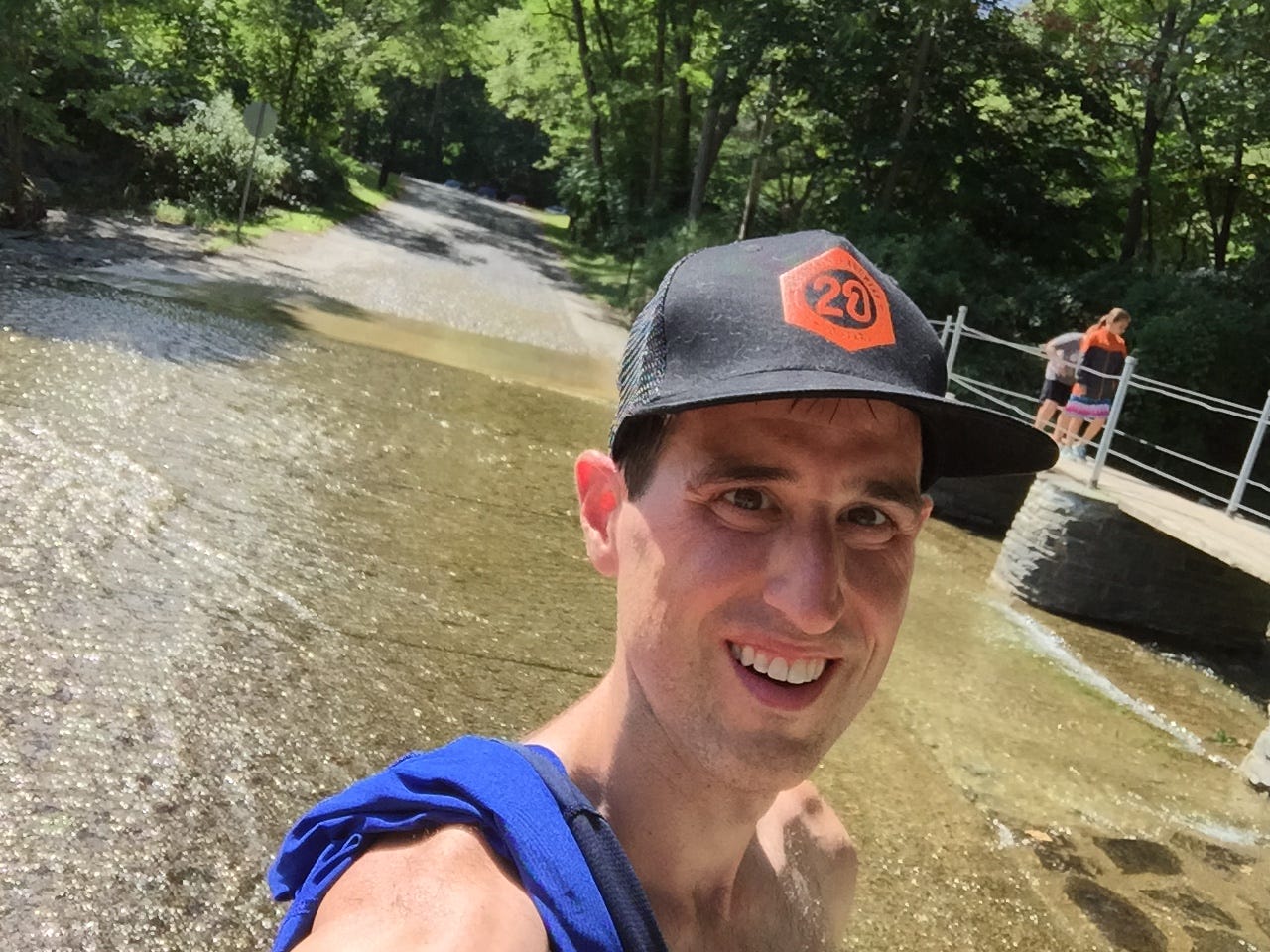 After the Old Mill, there were a few delightful minutes running narrow, level singletrack with foliage tightly packed on both sides. Then we were at the top water crossing, a deeper crossing that got my feet nice and wet, and even a few splashes up on my shorts. I was grateful to not slip here, and quickly mounted the bank on the other side and kept on running.