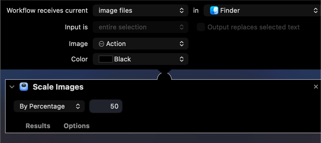 Follow these instructions to create a Finder automation to scale images by 50%, which in my case took a 10MB image down to 1MB or less. In the automator app, you can find the Scale Images action and configure a Finder automation like this: