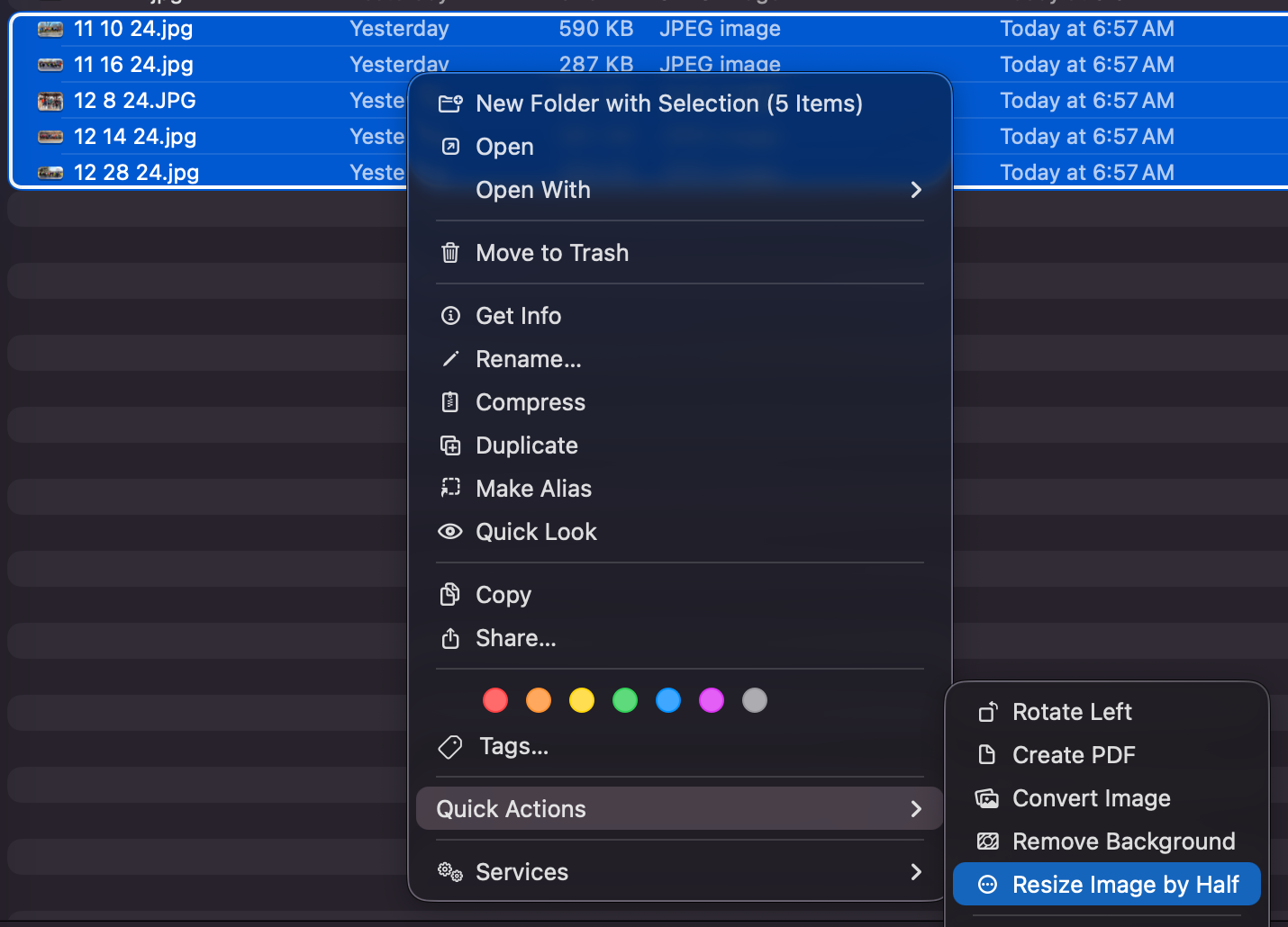 Then, you can sort images in the folder by decreasing size, right click, and select your automation from the Quick Actions menu.