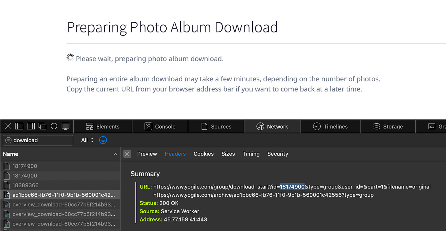 Whoa. When you consider that each download requires clicking “Download this Album,” waiting for AWS to zip the files and generate a link, then navigating back and remembering which part comes next, it quickly became clear there had to be a better way. I initially tried using ChatGPT to help me write a Perl script to automate the process, but because of how Yogile secures albums and handles downloads, that approach turned out to be a dead end. Instead, I landed on a solution that eliminated most of the clicking and waiting by using the browser’s Inspector—Safari, in my case, since it automatically unzips files after download.