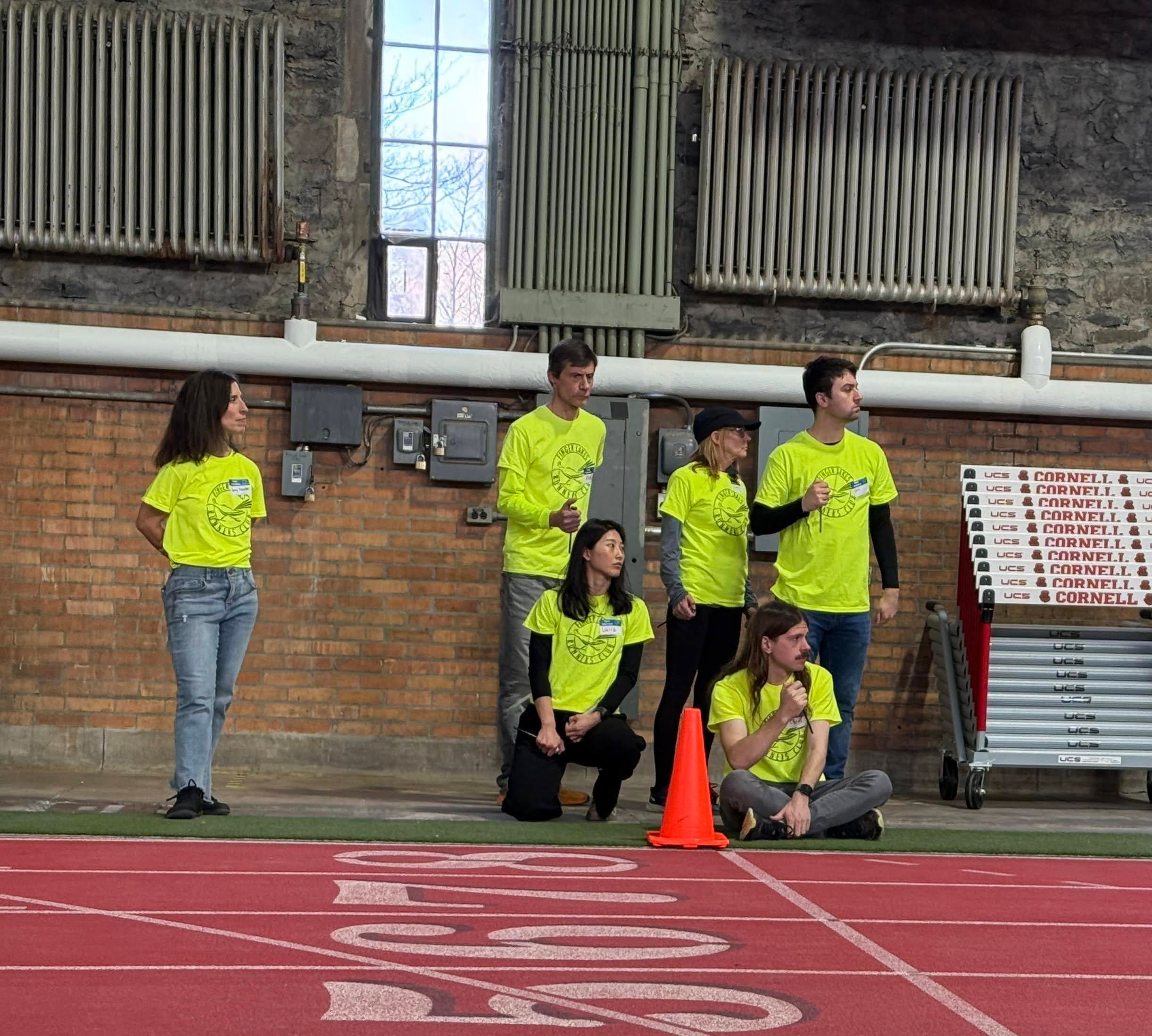 Amy and I volunteered to hand time for Finger Lakes Running Club’s February track meet. Here’s how that looks, where we all have a lane assignment and a button we click when the runner in our lane crosses the finish line. Amy had a bye for this particular heat, as no runner was in her lane. It’s a really fun job, especially when timing the very youngest runners who can weave from one lane to another, so you have to pay close attention to what they’re wearing!