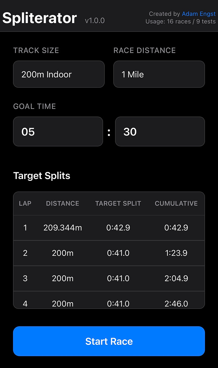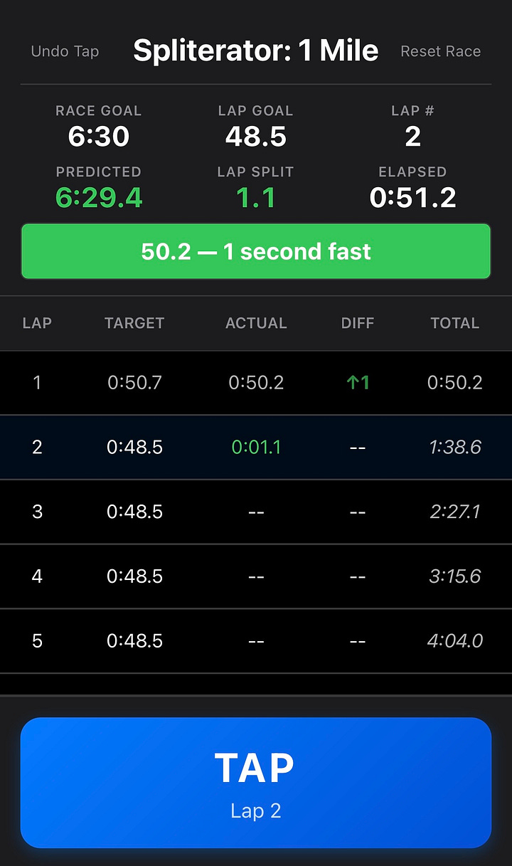 Anyway, I took the chance to run another mile race during the meet, and Amy helpfully called out my splits. Adam Engst created a cool web-based app, Spliterator, to help people do just that. You plug in the track distance, race distance, and goal time, and the app does the rest. As Amy pressed the split button as I crossed the 200m mark each lap, the app clearly showed the split time and how many seconds fast or slow it was. Zoom into the screenshots below for a closer look. It was SO helpful to have her shout 1 fast, or 1 slow, and I was able to make minor adjustments each lap in response. It helped me best last month’s Hartshorne time by 2 seconds.