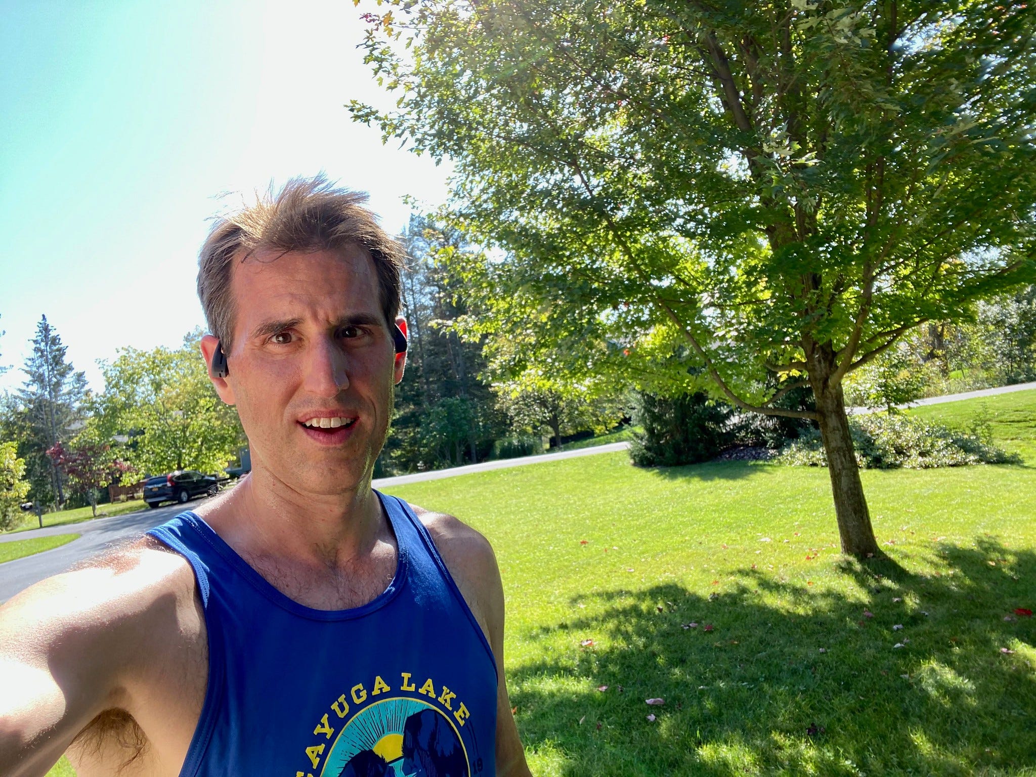 I had no idea what to expect. I run alone most of the time. As we chatted pre-race, I asked what others planned to do while the race was underway. The event had the potential to have the most heavy breathing I’ve ever heard on a conference call! Some said they’d leave their cameras on while they ran, some said they’d disconnect and rejoin after their run, and one creative athlete jerry-rigged a camera to his hat so people could see his progress! I opted to stay connected to the call while muting myself, carrying my phone with the camera facing out as I ran. I had to laugh as I ran: my friend Raul, who had done the 5k as a SWIM (totally badass) the prior evening, commented that the Zoom video looked like an episode of Cops. Here we were, some with cameras on, shakily making our way to the 3.1 mile mark.