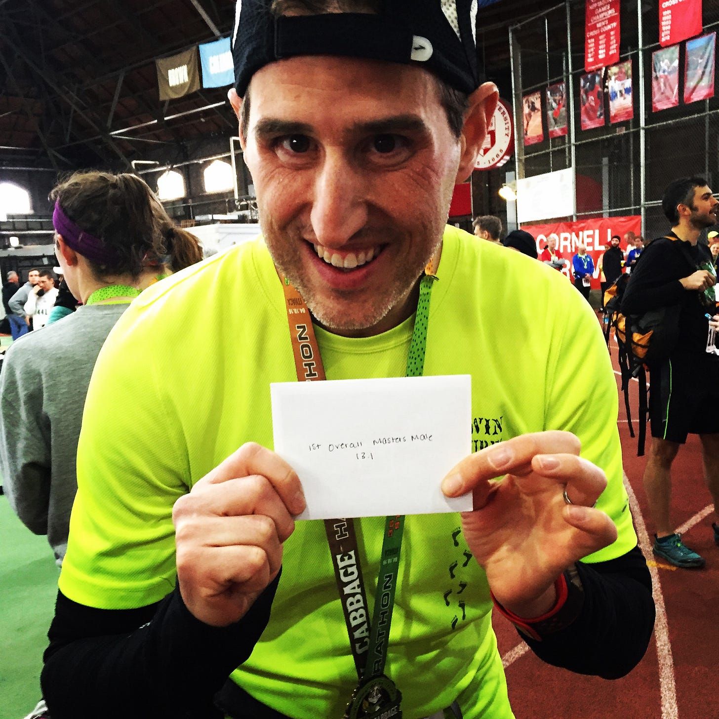 The last four miles, while flat and moderately downhill, were really where I had to focus on my pace. Someone who looked close to my age (he was 38) was on my heels, and I had kicked a bit to get ahead. Keeping my head engaged, despite the physical discomfort, worked wonders in this case. With the downhill assist, I negative split these miles at 7:03, 6:54, 6:39, 6:22 and a final tenth sprint at 5:14. I was so grateful to cross the line, and EXACTLY at 1:30:00. I tried really hard to sprint it out at the end so there’d be no seconds beyond 1:30, and I wasn’t sure if I’d done that until they posted the results. While looking at the results, although I didn’t set a course PR for myself, I found out that I was the masters winner! There were three veteran (50-59) winners that finished before me, so I have a feeling my fastest days are in front of me!