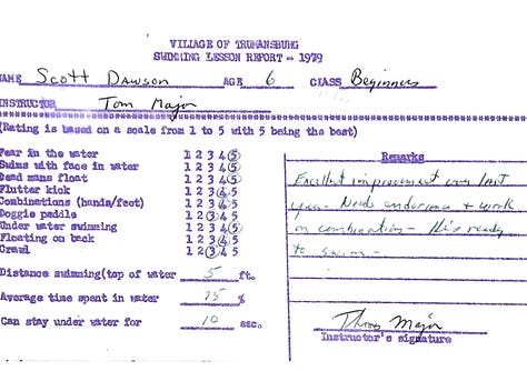 At age 5, Tom Major noted a strength, that I would attempt anything he asked me to do in the water. I have a feeling this will come in handy with these lessons, 38 years later!