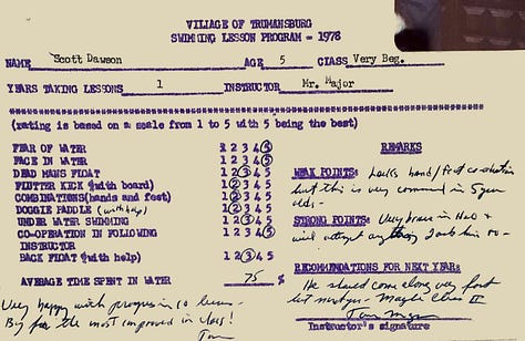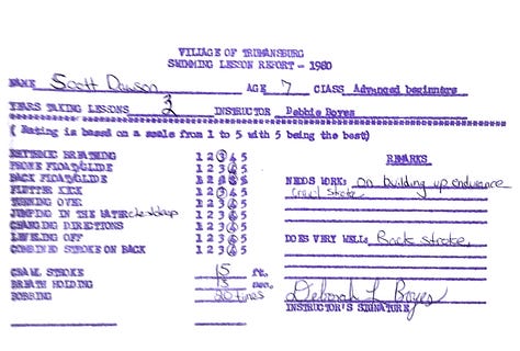 I learned to swim in the Trumansburg Learn-to-Swim program when I was 5 years old. Ironically, I took these very first swim lessons in the stretch of Cayuga Lake where the Cayuga Lake Triathlon swim leg kicks off, at Taughannock Falls State Park. Just to start this section off with a little fun, I uploaded my swim scorecards (my mother kept everything, bless her). A few highlights: