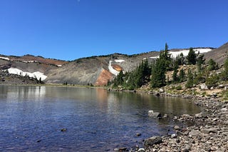 Expansive views of Broken Top were before us and to our side for much of the hike. We crested the last rise before No-Name Lake just after just 2 miles…